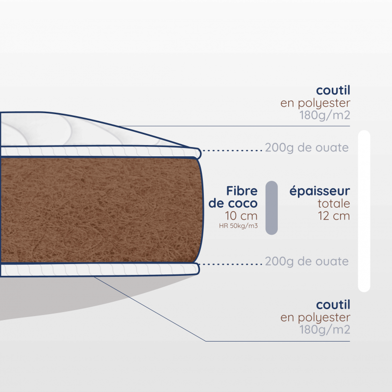 Pour offrir à votre bout de chou un sommeil de qualité, nous vous proposons également différentes sortes de matelas en mousse polyuréthane HR35kg/m3. Ils sont à la fois fermes et à haute résilience. Nous avons également des modèles en fibre de coco 50kg/m3 parfaitement adaptés pour le berceau ou le lit de votre tout petit.